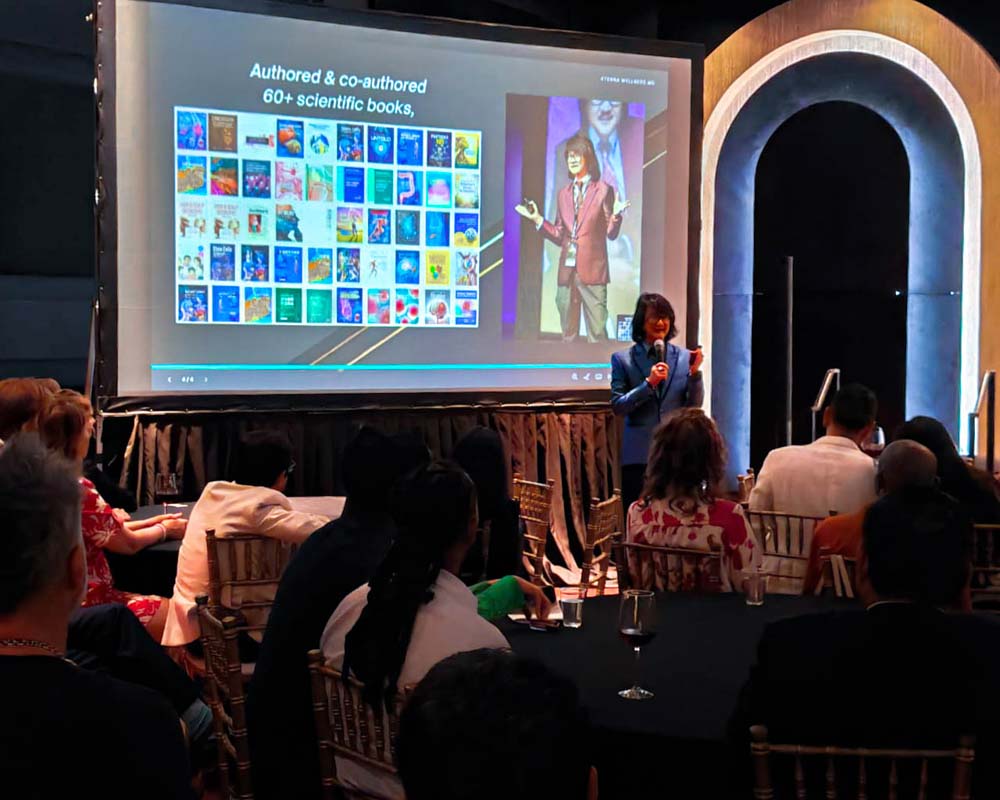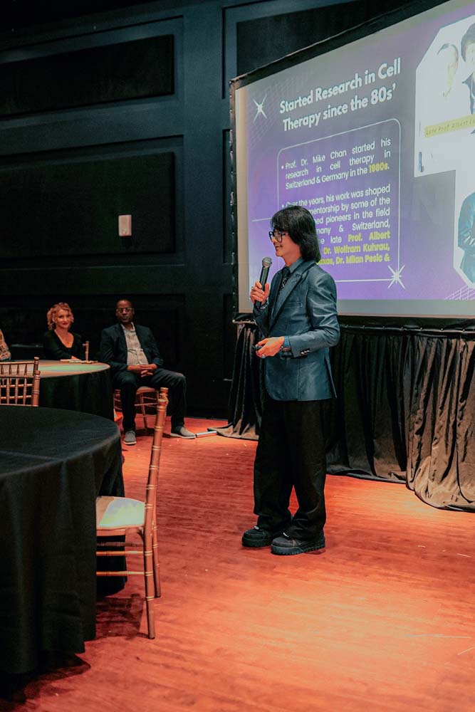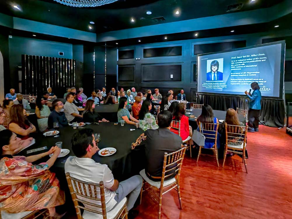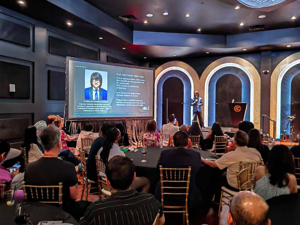 The highlight of the evening was a comprehensive presentation by Prof. Dato’ Sri Dr. Mike Chan, the chief scientist and founder of the European Wellness Biomedical Group. With over 40 years of pioneering experience spanning Europe and the USA, and a distinguished reputation for introducing stem cell research, peptides, and exosomes research and therapies to the Asia Pacific region in the mid-1980s, Prof. Mike Chan’s expertise stands unparalleled in the field. His presentation delved into the new trends in regenerative medicine, focusing on the intricate and highly specialized domains of targeted organ-and-brain-specific precursor stem cells, peptides, and exosomes. The audience of top medical specialists gained rare insights into cutting-edge bioregenerative therapies from one of the world’s foremost authorities in the field, offering a transformative learning experience that bridged advanced scientific research with practical clinical applications.