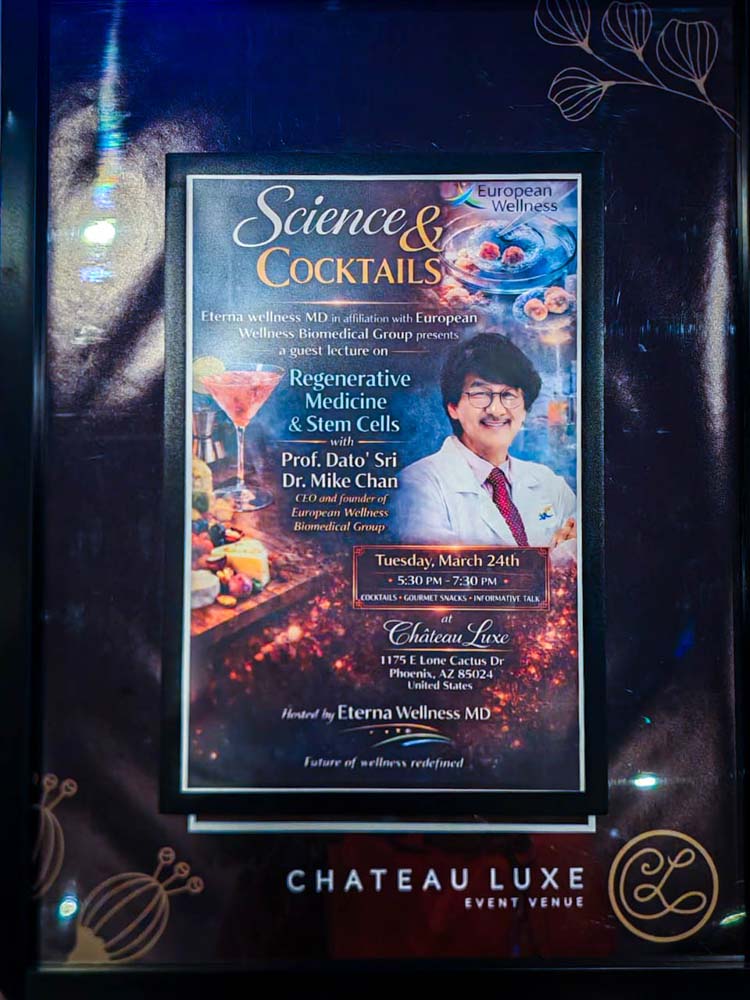 On Tuesday, March 24, the prestigious Chateau Luxe in Phoenix, Arizona, became the epicenter of scientific innovation as Eterna Wellness MD hosted an exclusive “Science & Cocktails” evening. The event brought together approximately 100 distinguished medical professionals and wellness leaders, including top oncologists, neurologists, cardiologists, pediatricians, and internal medicine specialists from across Arizona. Among the notable attendees was James Strole, the founder and Director of RAADfest, the largest global longevity event for a general audience, underscoring the significance of the gathering. Prof. Dato’ Sri Dr. Mike Chan was invited as the guest speaker by Dr. Pankaj Jain, Co-founder and President of Eterna Wellness MD, who specializes in internal medicine. Together, they curated an evening dedicated to exploring the future of regenerative medicine and stem cell therapy.