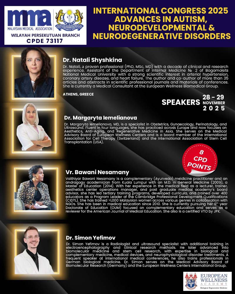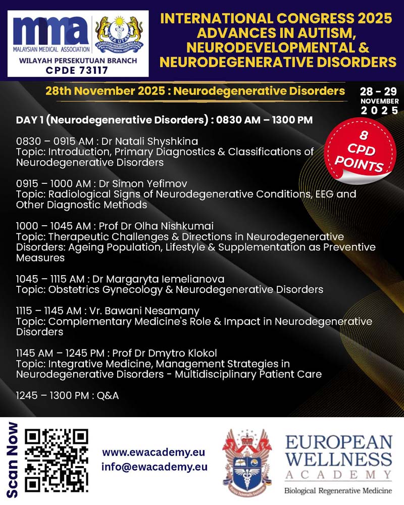 Furthermore, the congress will examine the expanding role of complementary and alternative medicine within neurodevelopmental disorders, emphasizing culturally sensitive, evidence-informed integration within multidisciplinary care frameworks. Current concepts of attention-deficit/hyperactivity disorder diagnosis and management will be addressed, with a focus on individualized, multimodal approaches combining pharmacological and psychosocial treatments. By fostering expert exchange and multidisciplinary collaboration, ICAANND2025KL aims to advance the understanding and clinical application of integrative medicine in the complex realm of neurodegenerative and neurodevelopmental disorders. This congress is an invaluable platform for physicians to gain actionable insights and contribute to improving patient care outcomes across the country.