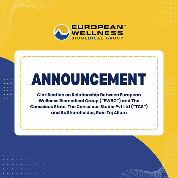 Clarification on Relationship Between European Wellness Biomedical Group (“EWBG”) and The Conscious State, The Conscious Studio Pvt Ltd (“TCS”) and its shareholder, Ravi Tej Allam