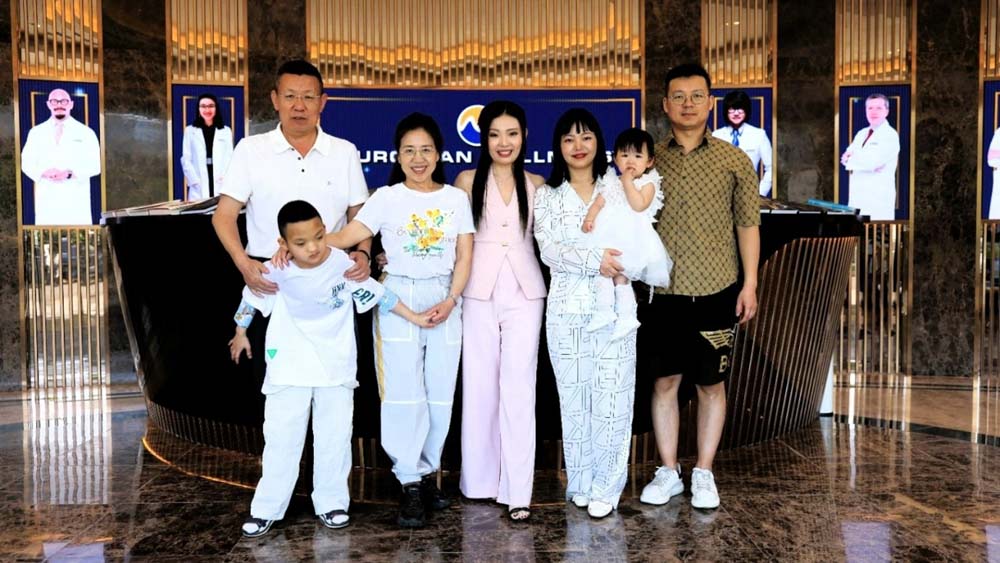 (4th from left): Li Hong Xian and family with Prof. Mike Chan, who warmly embraced the child with care and compassion, together with Prof. Dr. Olha Nishkumai, Cardiologist, Rheumatologist, and Internal Medicine specialist, and the European Wellness medical team.